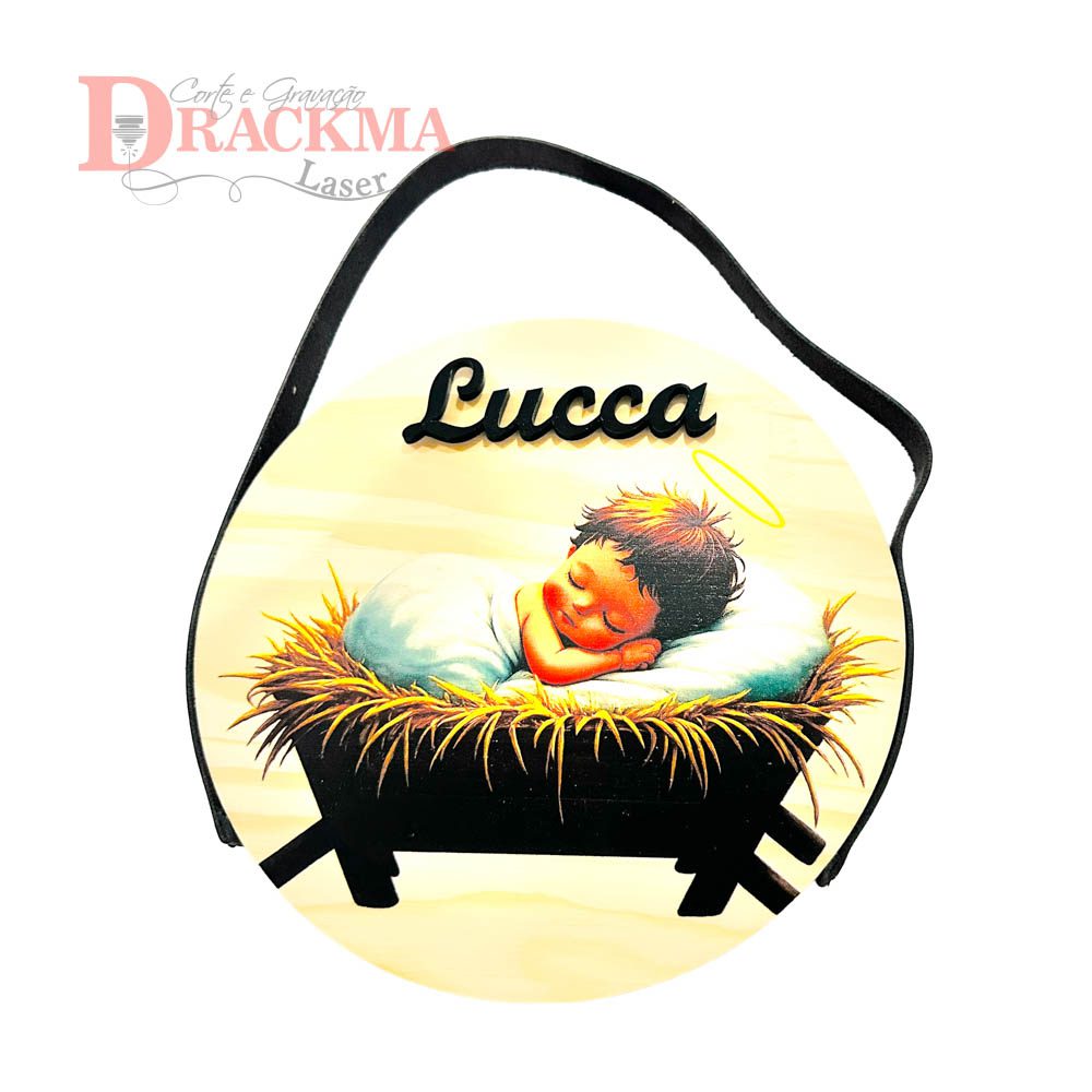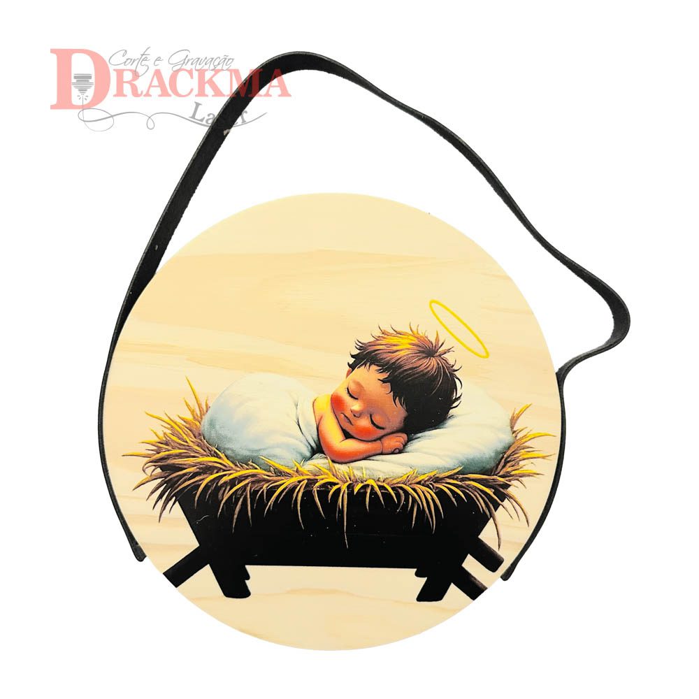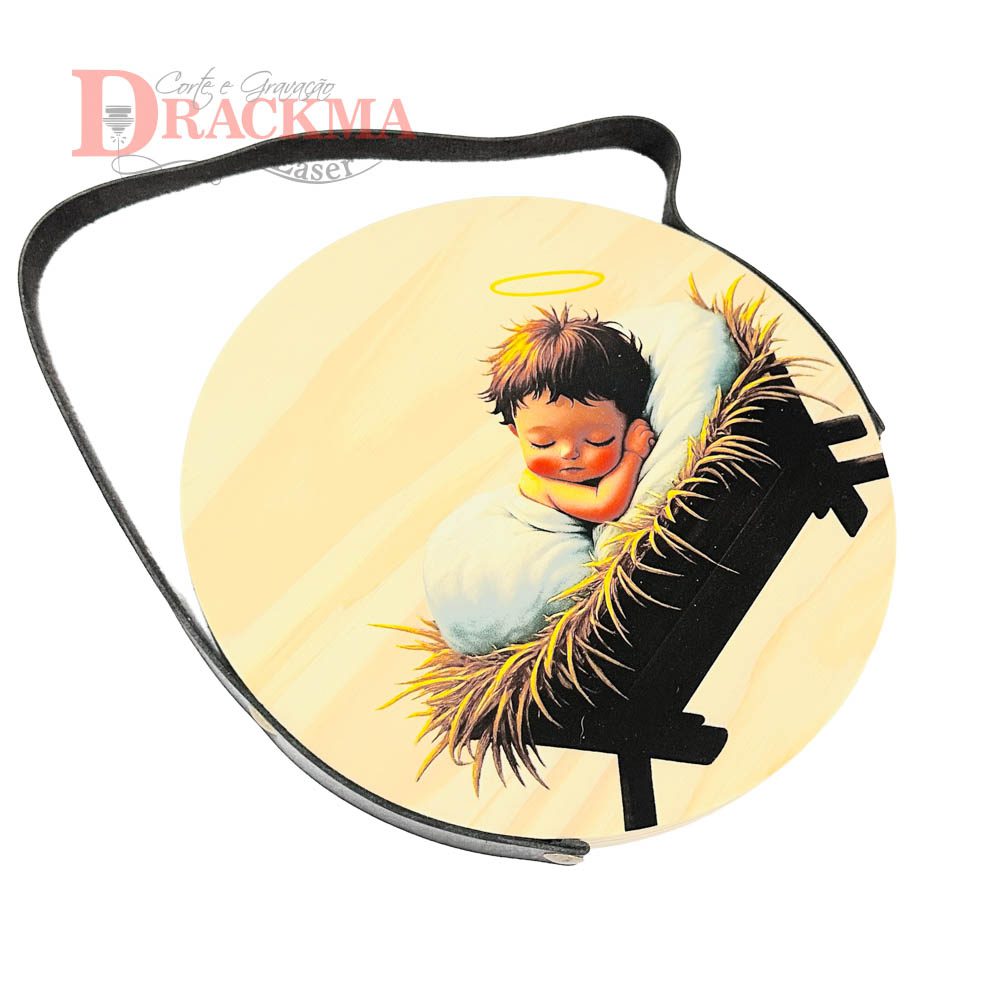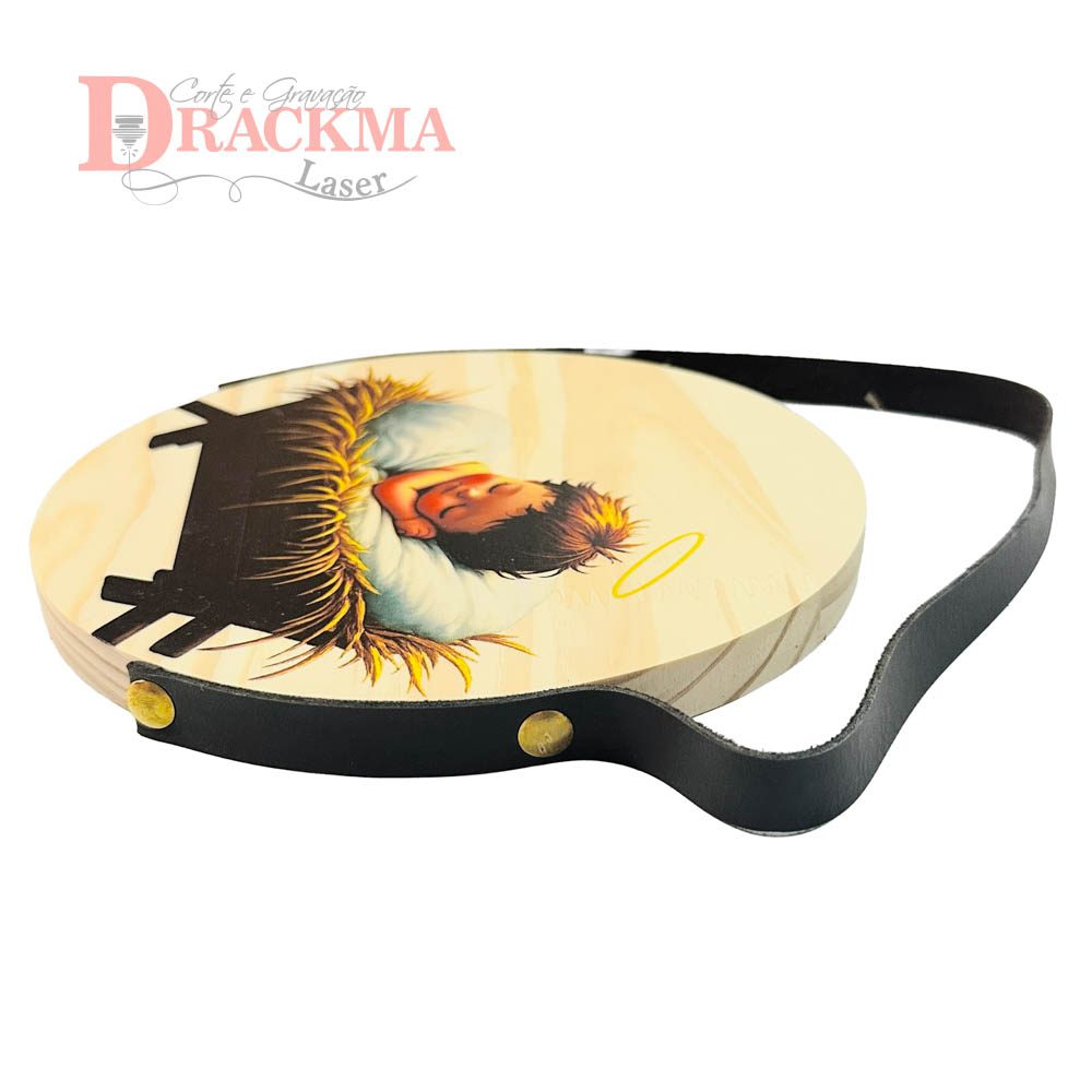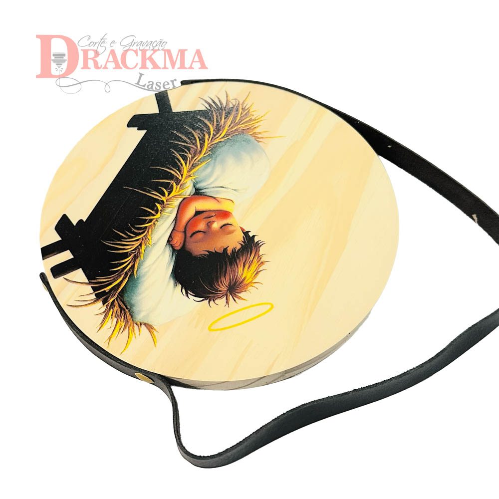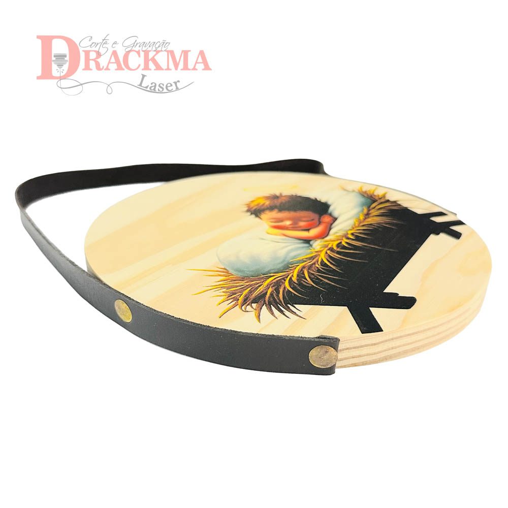 Produzida em Pinus maciço 15mm, com 20cm de diâmetro e impressão UV direta na madeira.